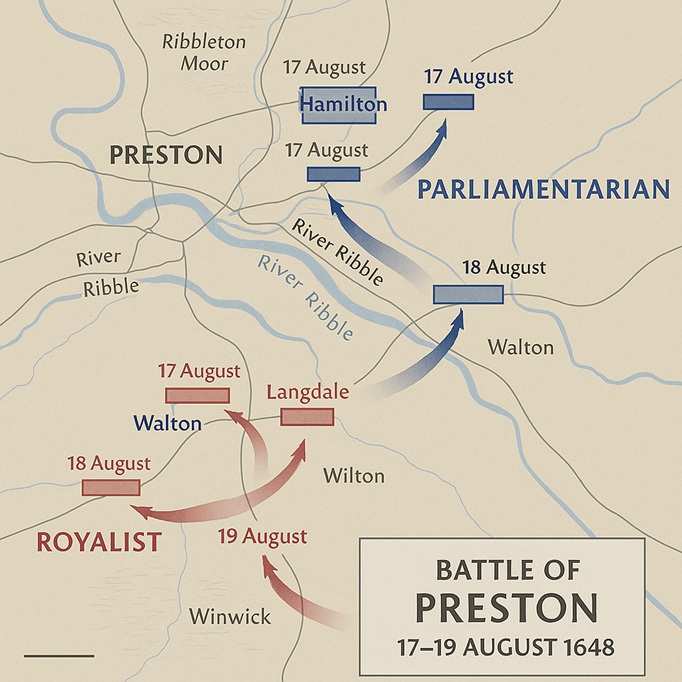 Cromwell surprised Hamilton’s scattered forces around Ribbleton Moor. Langdale’s infantry formed a defensive line that held off Parliamentarian cavalry with pikemen. After fierce combat, what Cromwell termed “a very stiff and sturdy resistance,” Parliamentarian infantry and local militia cracked the line and swept toward the Ribble bridge, forcing a breakthrough.